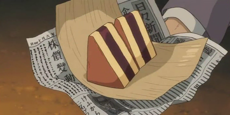Coppia di fette di torta triangolare di Castella cake giapponese farcita con gelatina Yokan di fagioli rossi azuki.